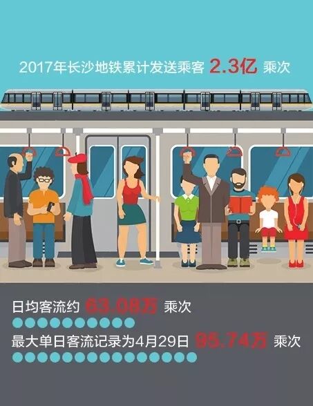 2017年全年,长沙地铁1、2号线分别累计开行列车10.55万列次和14.14万列次,线网运行图兑现率、正点率均为99.99%;线网运营总里程达615.6万公里。2017年全年,长沙地铁累计发送乘客2.3亿乘次,较上年度增长约21.3%。其中2号线1.4亿乘次,1号线0.9亿乘次。