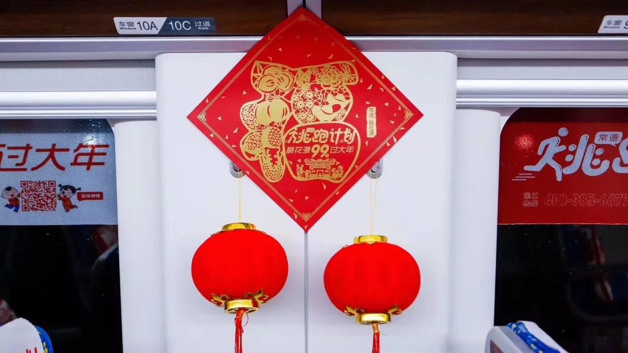 常德桃花源石长专列年味十足,红灯笼、福字挂满了车厢,剪纸风格的地贴,一派红红火火的新春景象。