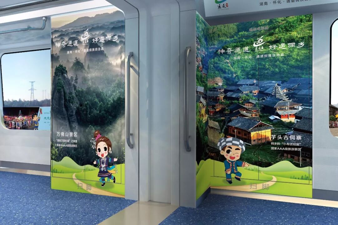 此次磁浮专列以“神奇通道,好运侗乡”为主题,以实景效果呈现“最美空中侗寨”。时值初夏时节,整趟列车以蓝绿色为基调,穿插通道县春夏美景,给人清爽浪漫的感觉,车厢内从历史文化、民俗风情与绚烂风光等方面来呈现通道民俗风情,集中展示了万佛山、皇都侗文化村、通道转兵纪念地、恭城书院、芋头古侗寨等风景名胜,并结合通道的人文风俗:芦笙节、合拢宴、侗族歌舞。此次亮相的“神奇通道,最美侗乡”主题专列一上线便成为了怀化全域旅游的一张崭新名片。