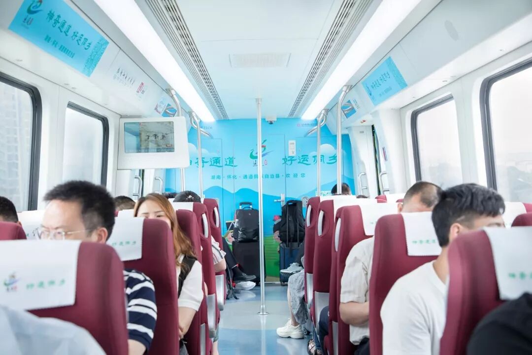风华千面通道城,诗情画意侗乡人。“神奇通道 好运侗乡”磁浮专列乘着初夏的旋律翩翩而来。市民乘客可在磁悬浮之旅里“穿越时空”,漫步空中侗寨,一览侗乡的山川秀丽、历史人文与民俗风情。