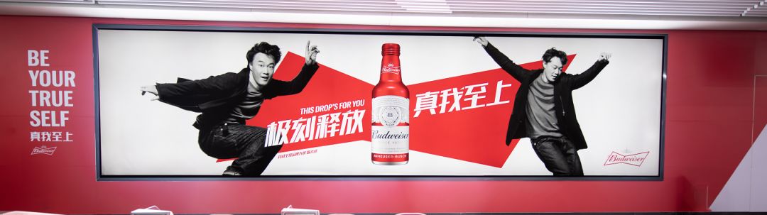 百威啤酒跃上国字号交通枢纽火车南站品牌墙,大面积展示空间,高像素鲜亮画质,整个墙面都在诉说着百威随性、真我的本质。